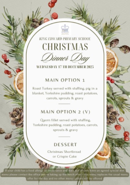 Please see below our Christmas Dinner Day menu which is available to all children on Wednesday 17th December 2025. The cost of this meal will be £2.60 for children in Nursery, Years 3, 4, 5 & 6. This meal will be free to children on benefit related free school meals and to children entitled to universal free school meals in Reception and Years 1 & 2. You can pay for the Christmas Dinner for your child on the Gateway app. Children then book their lunches in school on the day. There will be no other meal options on this day (ie no sandwiches, jacket potatoes etc). If your child does not want a Christmas lunch, please provide a packed lunch.