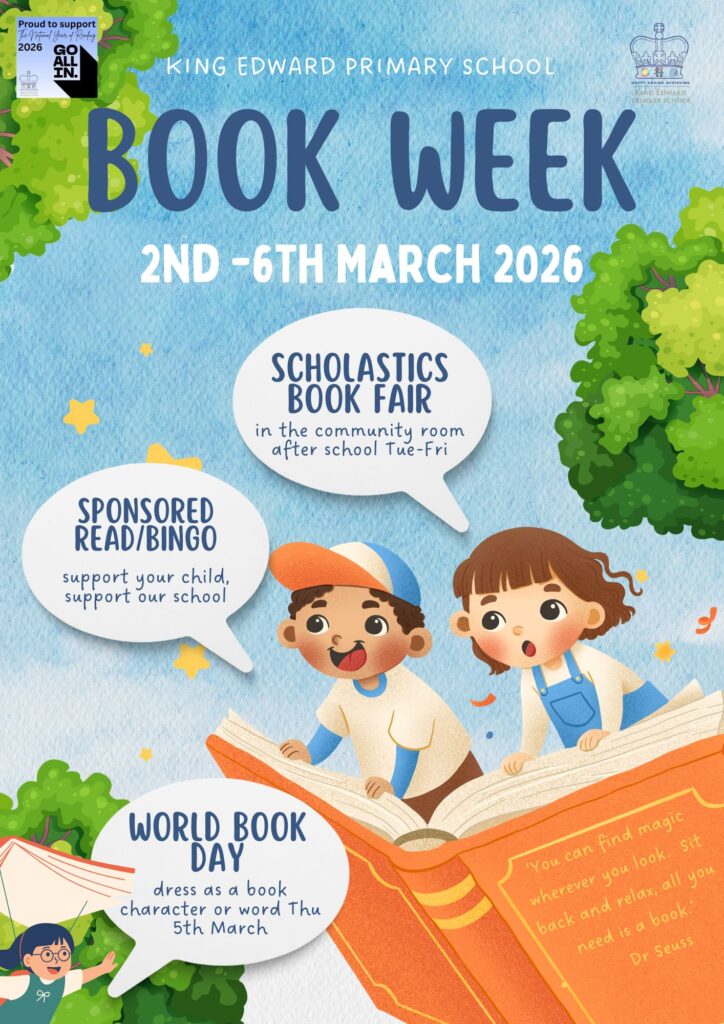 King Edward Book Week – Monday 2nd March – Friday 6th March 2026 Share and Follow: Posted in Uncategorized ← Nursery, Reception & Year 1 – Sponsored Book Bingo – Monday 2nd March – Sunday 8th March 2026Parents Evening – change of date →