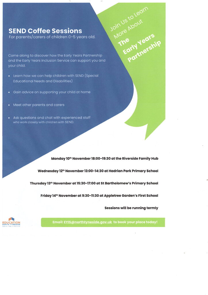 The Early Years Partnership would like to invite families to their upcoming Coffee & Chat Meet and Greet session, created especially for parents and carers of children aged 0–5 with Special Educational Needs and Disabilities (SEND).